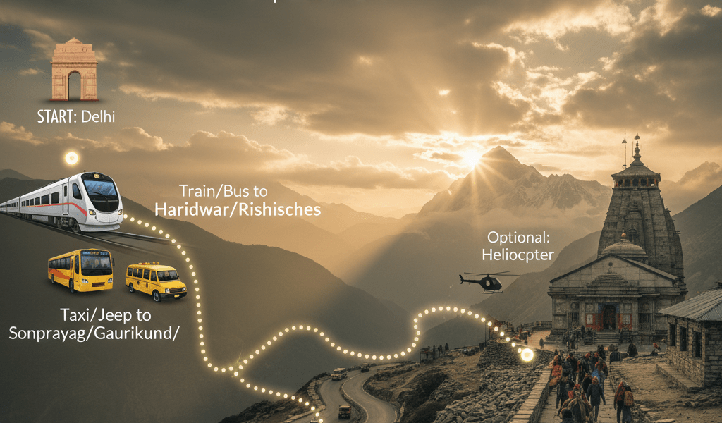 Delhi → Haridwar/Rishikesh → Rudraprayag → Guptkashi → Sonprayag → Gaurikund → Kedarnath