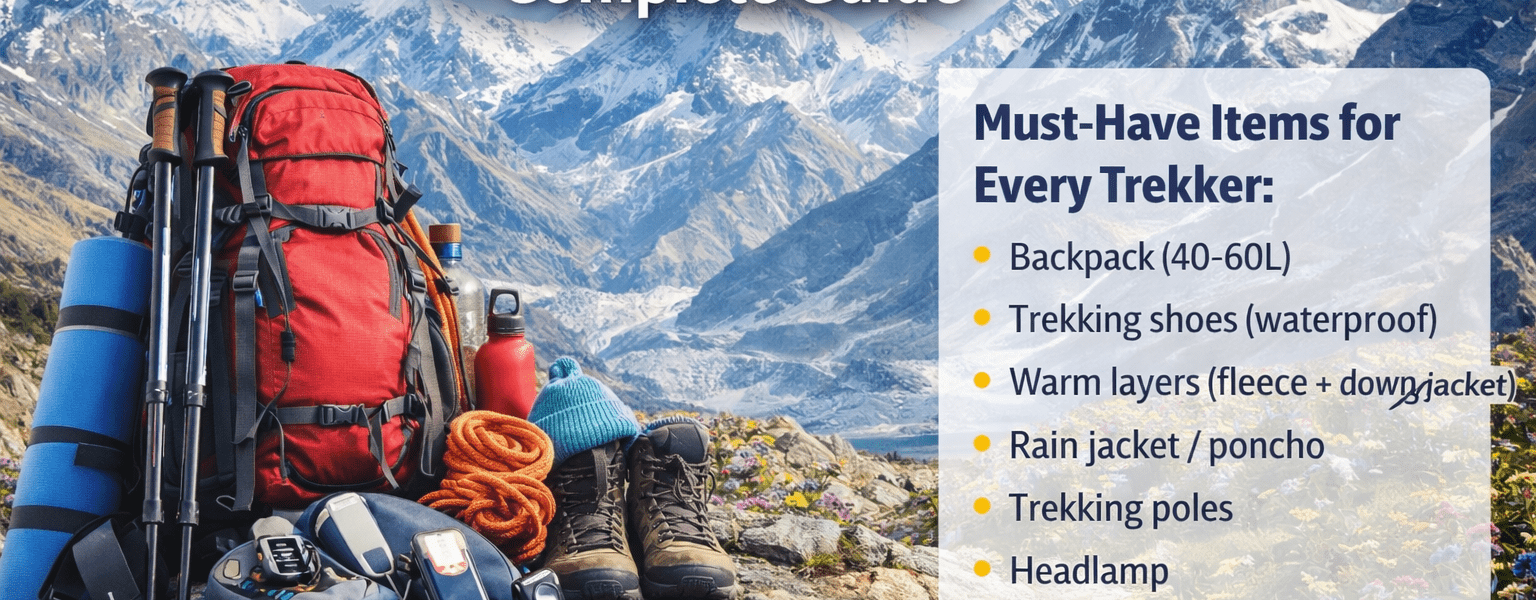 mountain trekking equipment list : it is the foundation of a safe and successful Himalayan adventure. Whether you are heading to Kedarnath, Valley of Flowers, or a high-altitude expedition, carrying the right gear can make the difference between comfort and crisis. This guide covers essential trekking gear, seasonal packing tips, budget insights, and expert advice for beginners and experienced trekkers alike.